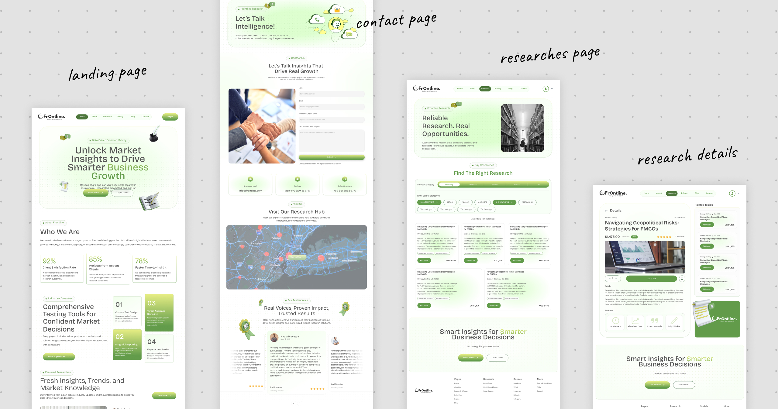 Businesses and decision-makers need reliable, data-driven market intelligence to grow strategically — but existing research platforms feel either too academic, too fragmented, or too expensive without clear value communication. The challenge was to design a professional, trustworthy, and commercially viable platform where companies can discover, purchase, and engage with market research reports, while also positioning Frontline as a premium consulting brand.