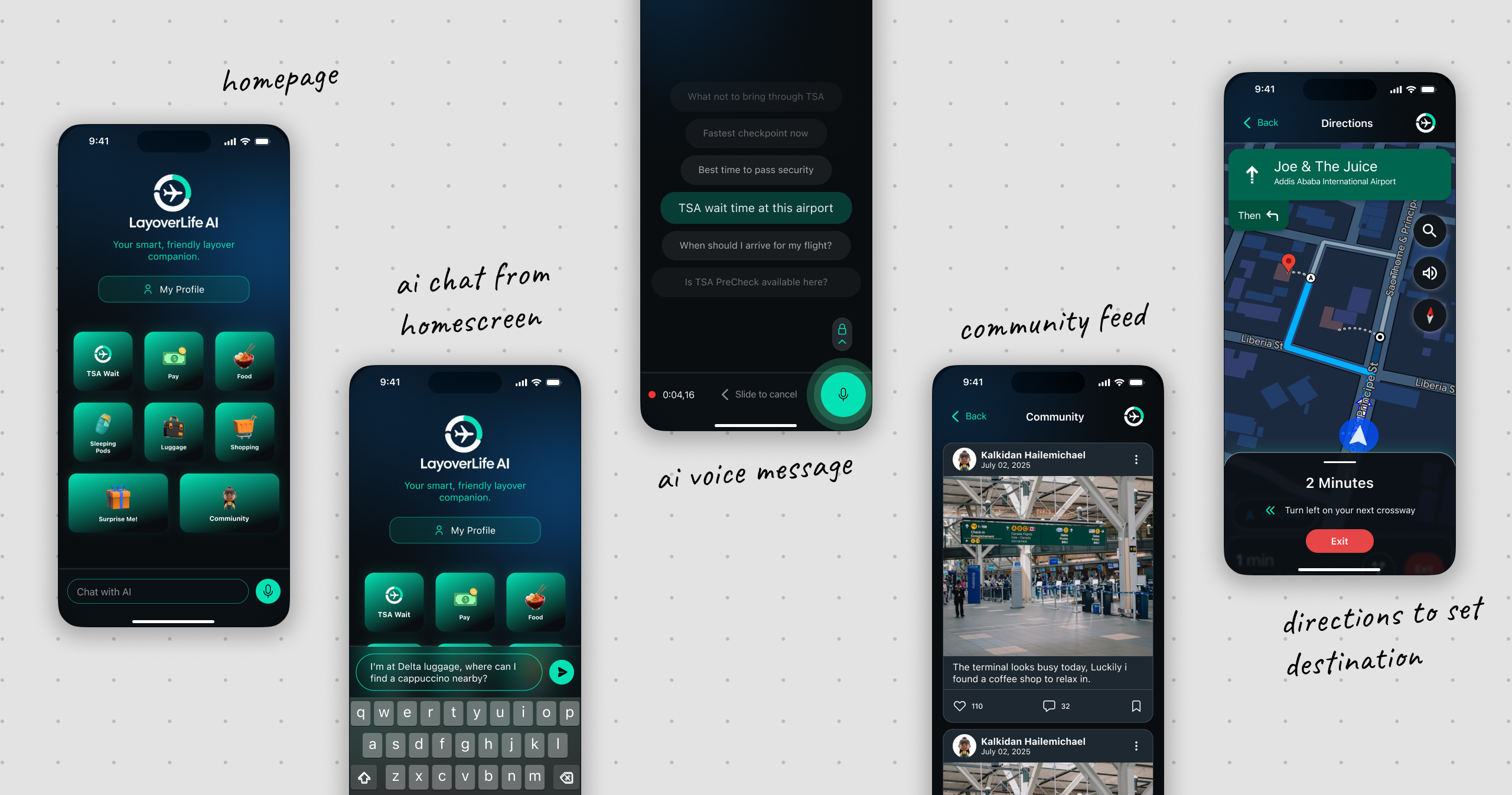 Layovers are dead time — but they don't have to be. Whether it's a 45-minute sprint or a 6-hour wait, travelers in airports face the same cluster of small, annoying problems: where's the nearest decent coffee? How long is the TSA line? Can I order food before I even get there? The information exists, but it's scattered across airline apps, Google Maps, airport websites, and strangers. LayoverLife AI brings it all into one AI-powered chat interface — a single place where travelers can ask anything about their airport, get smart answers, and act on them instantly (directions, ordering, payments) without ever switching apps.