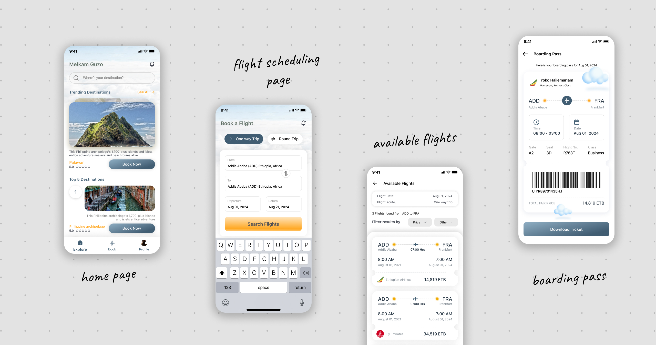 A great aviation app is a cultural artifact — writing the app name in Ge'ez script on the splash screen was the single most-commented element in testing, building instant connection|Separating Explore from Book was the most impactful structural decision — inspiration and intent require different mental modes; conflating them caused hesitation while separating gave users clarity and confidence|The boarding pass is the emotional peak of the experience — investing design effort in treating it as a digital keepsake rather than a data dump turned a functional endpoint into a moment of delight|Loyalty programme integration is undervalued in emerging market apps — including the Sheba Miles ID field was low effort but high signal telling Ethiopian Airlines frequent flyers that this app understood them