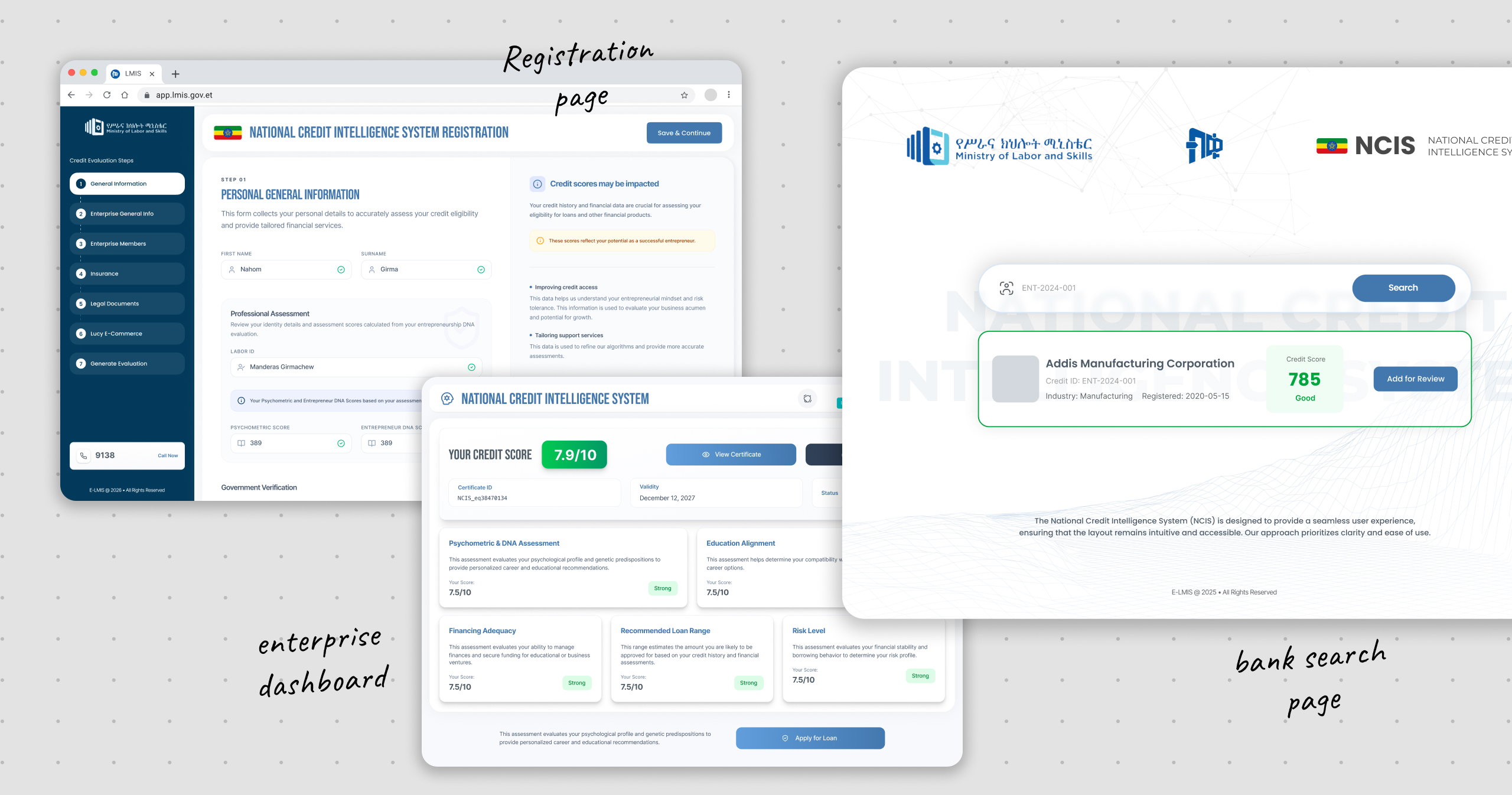 Ethiopia's informal economy — made up of micro-enterprises, sole traders, and unregistered businesses — has historically been locked out of formal financial services. Without a standardized credit history, verification system, or risk scoring mechanism, banks cannot lend to them, insurance companies cannot serve them, and government programs cannot track them. At the same time, formal enterprises also lacked a unified, trusted digital certificate of creditworthiness. The challenge was to design a national-scale credit intelligence platform that evaluates and scores creditworthiness across enterprise, personal, and informal sector applicants; bridges the gap between the E-LMIS labor identity infrastructure and financial services; and generates verifiable official credit certificates recognized by banks and government.